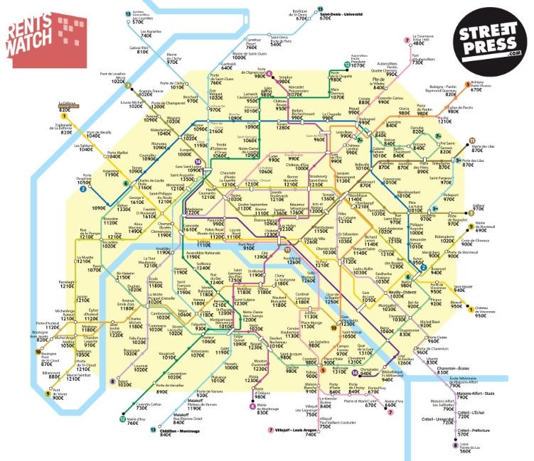 A partir de données récoltées par Rentswatch, projet d’enquête sur la crise du logement imaginé par les datajournalistes de l’agence J++, StreetPress a réalisé une carte des prix moyens des loyers, à proximité de chaque station de métro parisien.