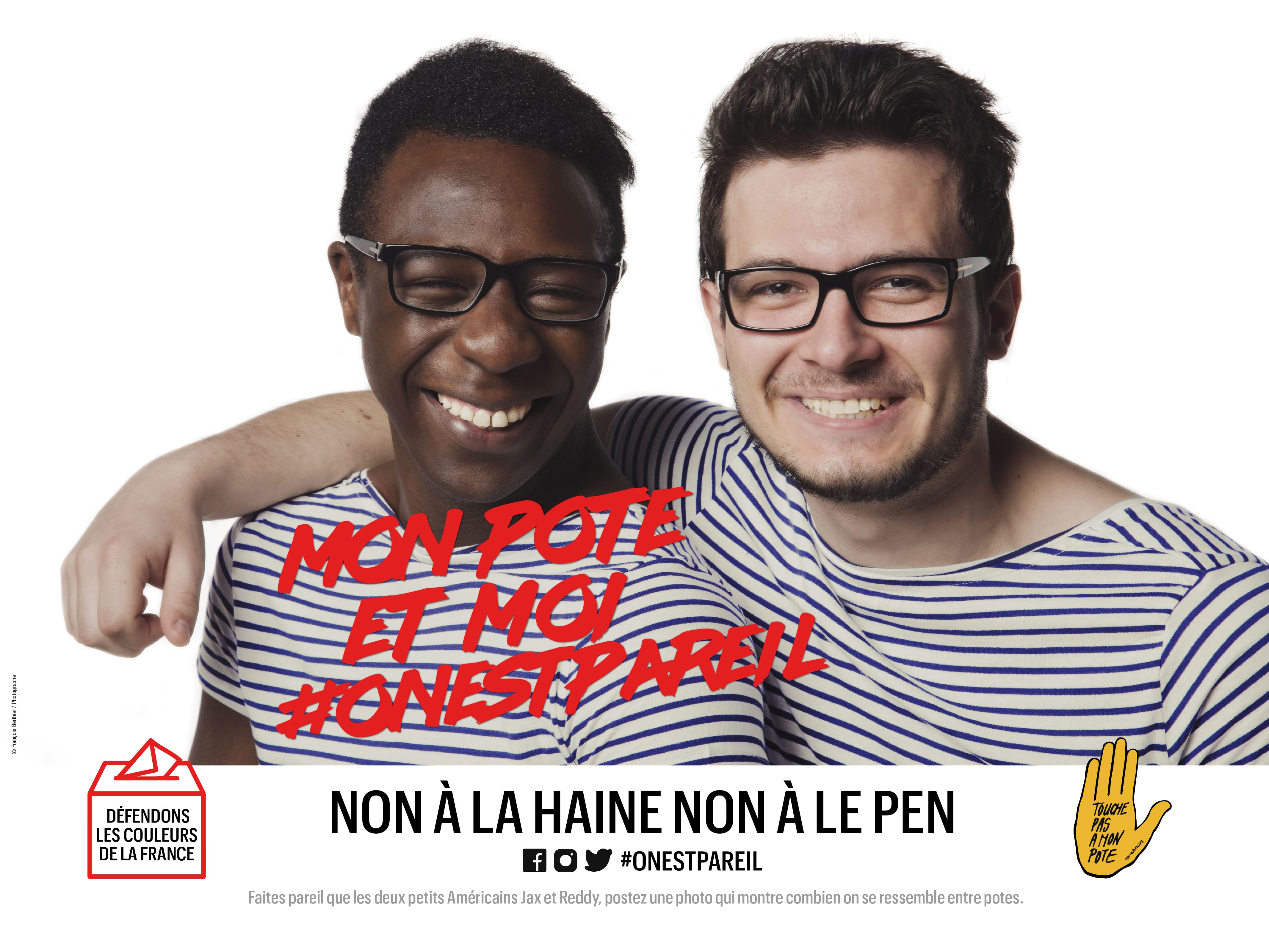 La dernière campagne de SOS Racisme est plus qu’affligeante. L’idée est de contrer les idées du FN. On y voit un.e blanc.he qui prend par l’épaule son ou ses ami.e.s noir.e.s et rebeu.e.s, tous et toutes tout sourire, avec le slogan : « Mes potes et moi on est pareils » .