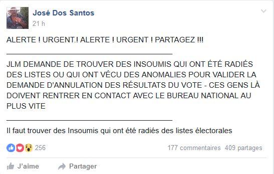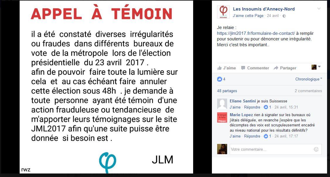 Le post a été épinglé sur la page « Je vote Mélenchon au 1er ET au 2e tour » , suivie par plus de 65.000 personnes. Joint par Streetpress, Raquel Garrido, porte-parole du mouvement, explique que la France insoumise n’est pas à l’origine de cet appel. Ce qui n’empêche pas le hoax de tourner en boucle , commenté et liké par des dizaines d’internautes. Les couacs de cette élection sont brandies comme des preuves accablantes que cette élection est non seulement décevante mais surtout illégale.