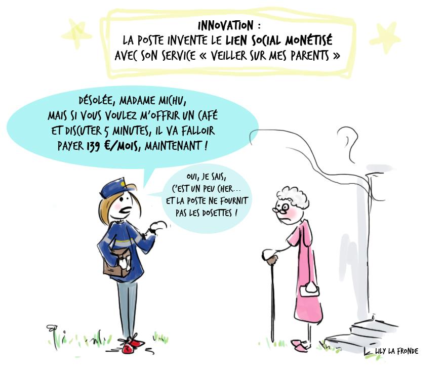 Lancé en novembre 2016 dans certaines régions pilotes, le service « Veiller sur mes parents » étendu à tout le territoire depuis le 22 mai dernier, a pour objectif, en apparence plutôt louable, de rompre l’isolement des personnes âgées. Sur le site de La Poste, on découvre l’alléchante offre de lancement : une visite par semaine à vos parents, effectuée par un facteur, dans le cadre de sa tournée, vous coûtera la modique somme de 19,90 € par mois. Quatre visites vous en coûteront 99,90 €, et six visites par semaine, le top du top, 139 € par mois. En contrepartie, La Poste enverra un facteur ayant suivi une formation de trois heures « co-construite avec le gérontopôle des Pays de la Loire » (ou suivie par internet), discuter 5 à 10 minutes, montre en main, avec votre vieux papa et/ou votre vieille maman.