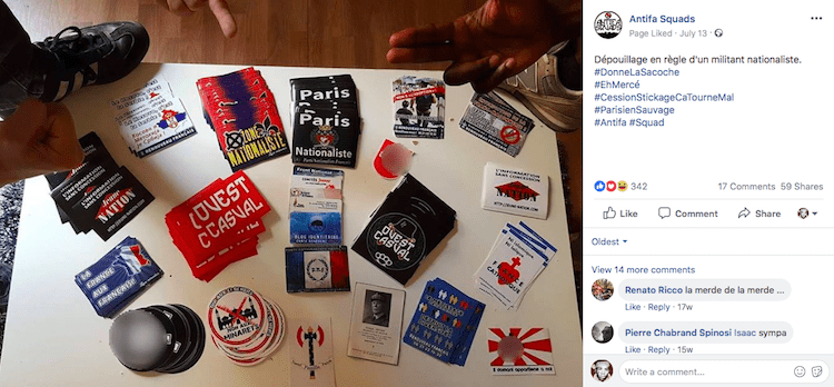 De part et d’autre, on affiche ses faits d’armes et ses trophées. Ainsi les antifas étalent une collection de stickers agrémentée d’un commentaire :