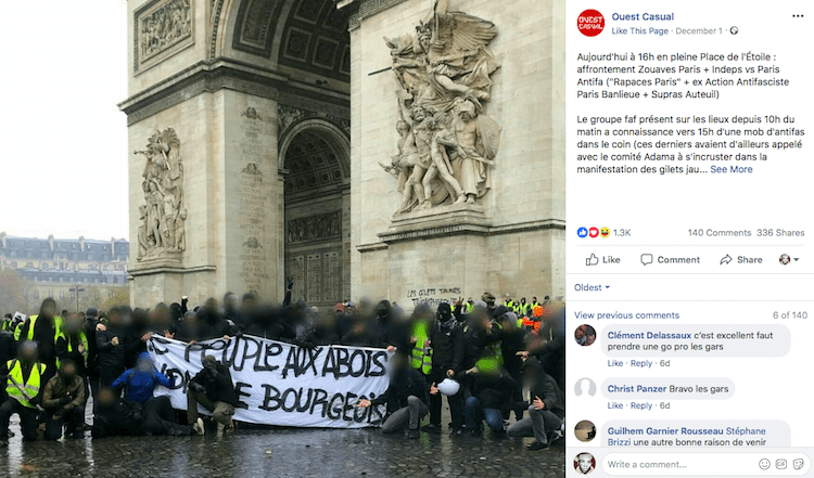 La fine équipe regroupe des hooligans venus de Nancy, une poignée de nationalistes autonomes, mais surtout des anciens du Groupe Union Défense ( GUD , groupuscule néo-fasciste violent) aujourd’hui affiliés aux Zouaves et au Bastion Social. Après la session photo, l’équipe part au contact avec les forces de l’ordre. La semaine suivante, six d’entre eux se font cueillir au petit matin par la police. Comme StreetPress vous le racontait , ils sont mis en examen pour des violences et dégradations commises sur l’avenue parisienne. Tous, à l’exception d’Aloïs V. envoyé derrière les barreaux de Fresnes, repartent libres en attendant leur procès. Au moins quatre des mis en examens sont membres du Bastion Social (BS) . À Chambéry, le samedi 15 décembre, des militants du Bastion se sont placés en tête du cortège des gilets jaunes , brandissant une banderole « Stop à la finance, libérons la France ». Une présence qui a fait grincer des dents. À Strasbourg, le mouvement gère la page Facebook Strasbourg se soulève , qui ne regroupe que 600 likes mais se définit comme la « page fédératrice du mouvement gilets jaunes » de la ville.