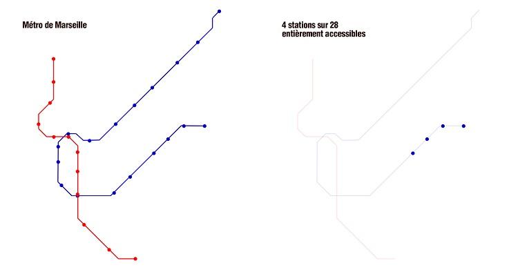 Les autres transports : D’après le site de la Régie des Transports Métropolitains, tous les bus sont équipés d’une rampe. Mais ils ne peuvent les déployer que sur 600 des 2 537 points d’arrêts recensés par l’opérateur. Le tramway est, quant à lui, entièrement accessible. Le service personnalisé Mobi Métropole couvre les 18 communes de Marseille Provence Métropole, en porte-à-porte et à la demande.