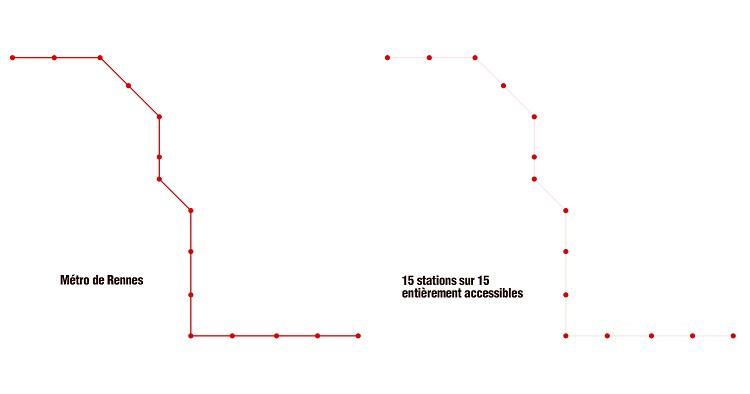 Le + : Le métro rennais est entièrement accessible pour toutes les personnes à mobilité réduite. Les 15 stations sont équipées d’ascenseurs. Il n’y a aucune marche, à aucune des différentes étapes du voyage, que ce soit à l’achat des billets ou sur les quais. L’accès à la rame se fait lui aussi de plain-pied.