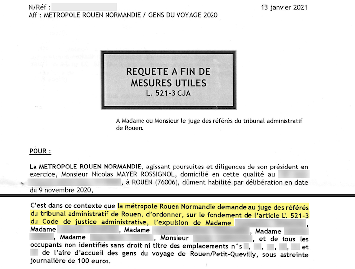 Propos louables mais parfaitement mensongers, comme le démontre la requête (1) adressée par la Métropole au tribunal administratif de Rouen que StreetPress s’est procurée. Il y est écrit noir sur blanc « que la métropole Rouen Normandie demande au juge (…) d’ordonner (…) l’expulsion de » … suivi d’une liste de noms. Pire encore, la métropole insiste sur le caractère urgent de la démarche.