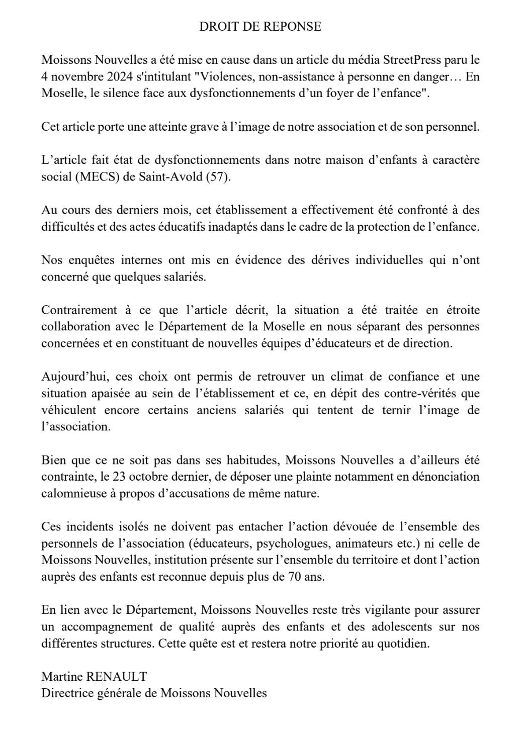 Le 8 novembre, le département de la Moselle a adressé un droit de réponse à notre rédaction. StreetPress le publie ci-dessous :